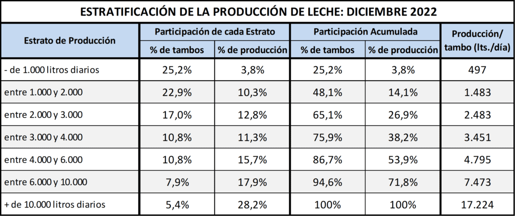 En el mes de diciembre de 2022, según los datos del SIGLeA-LUME, se puede observar una estratificación en la producción de leche en los tambos del país. Los tambos de más de 10.000 litros diarios de producción representaron solo el 5,4% del total de tambos, pero aportaron el 28,2% de la producción total. Por otro lado, los tambos de menos de 2.000 litros diarios representaron el 48,1% del total de tambos, pero solo aportaron el 14,1% de la producción total.