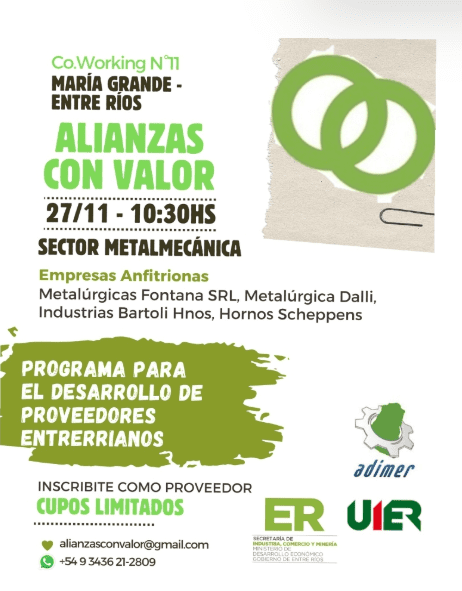 Este miércoles 27 de noviembre se llevará a cabo una nueva edición de la jornada «Alianzas con Valor» en el Área Industrial de María Grande, organizada por ADIMER. El evento tiene como objetivo fortalecer las cadenas de valor en el sector metalmecánico, promoviendo el intercambio entre empresas y proveedores del sector.